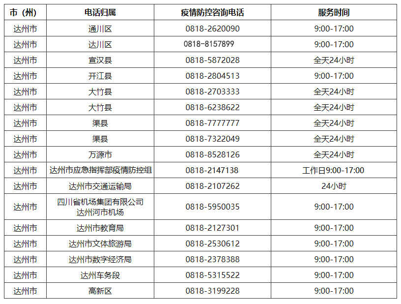 達(dá)州市新冠疫情防控指揮部咨詢電話:0818-2620090;
