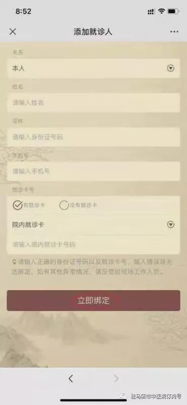2、 完成以上步驟后,點擊 “醫(yī)療服務(wù)”→“我的就診人” →“添加就診人”,輸入就診人詳細(xì)正確信息后,點擊“立即綁定”即可(同一個微信最多可添加5個就診人)