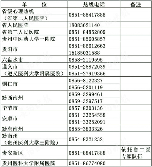 如疫情期間出現(xiàn)恐慌、焦慮等不良情緒,需要心理支持,請撥打省二醫(yī)24小時心理咨詢電話:0851-88417888(疫情期間,24小時接聽。疫情解除后工作日接聽);貴陽市精神病人康復醫(yī)院心理咨詢電話:0851-86612663(疫情期間,工作日接聽,早上9:00-12:00,下午1:00-5:00。疫情解除后取消)。