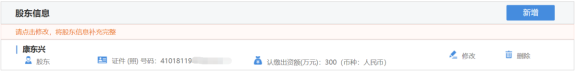 19. 點擊股東信息內的【新增】,系統(tǒng)彈出股東信息欄,如下圖所示,補充股東出資信息。
