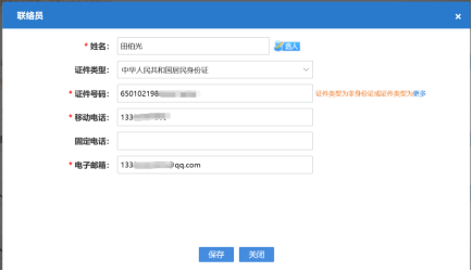 31. 點擊聯(lián)絡員信息欄右側新增,打開聯(lián)絡員信息錄入界面,選擇或錄入聯(lián)絡員信息,如下圖所示。