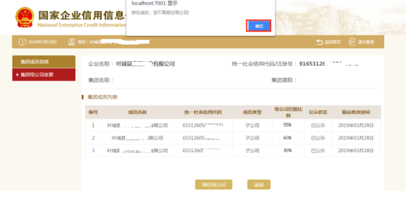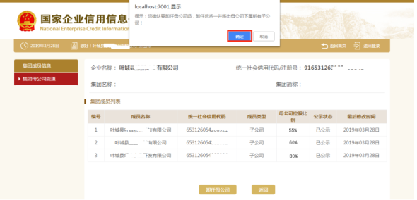 第三步:如果該法人企業(yè)非母公司或子公司第一次進入時會提示您確認要擔任母公司嗎?選擇確認后則將自己設為集團母公司。上傳母公司成功點擊確定進入集團成員信息填寫頁面