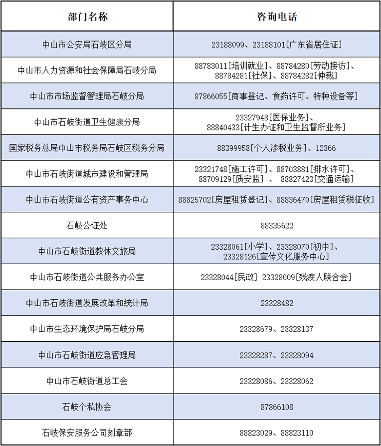 | 社會(huì)保障綜合窗口 | 中山市石岐區(qū)人社分局 | 23328830 |
