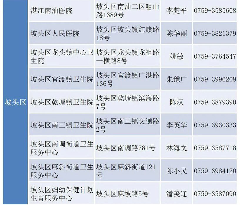 按照國家、省、市相關(guān)工作要求,湛江市坡頭區(qū)已陸續(xù)開展對重點人群和其他人群新冠病毒疫苗接種工作。近日,坡頭區(qū)衛(wèi)健委公布我區(qū)新冠病毒疫苗預(yù)防接種點。目前,坡頭區(qū)共有9家機構(gòu)可供市民預(yù)約接種新冠病毒疫苗。詳細(xì)單位名單、地址、接種時間和預(yù)約電話等信息看這里↓↓↓