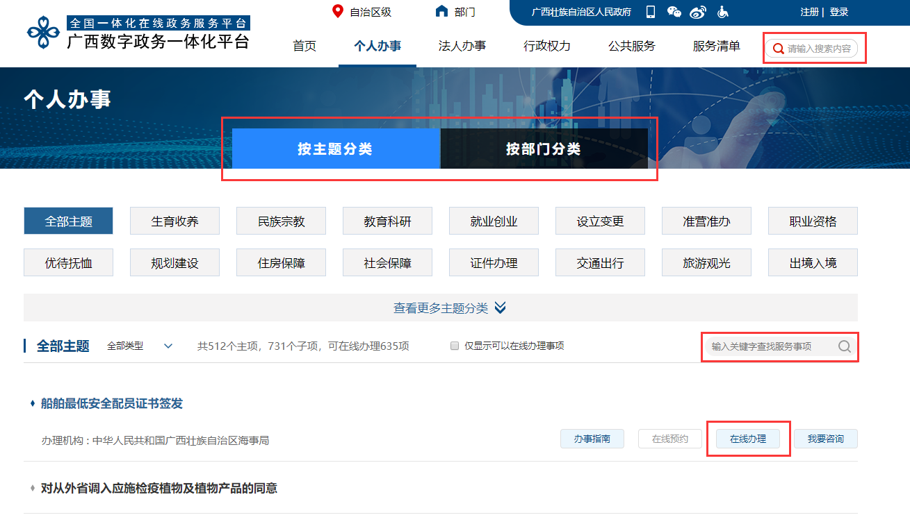 您可以通過事項類型,事項主題分類等方式快速鎖定事項,也可以通過關(guān)鍵詞快速檢索。