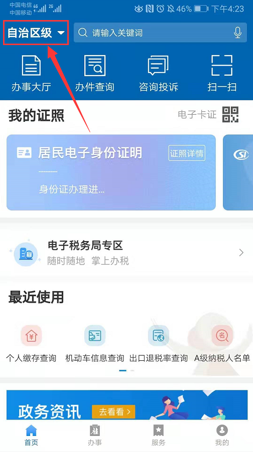 第四步:在“首頁”搜索對應(yīng)事項或者點擊下方“辦事”菜單查詢辦事指南進(jìn)行申報。