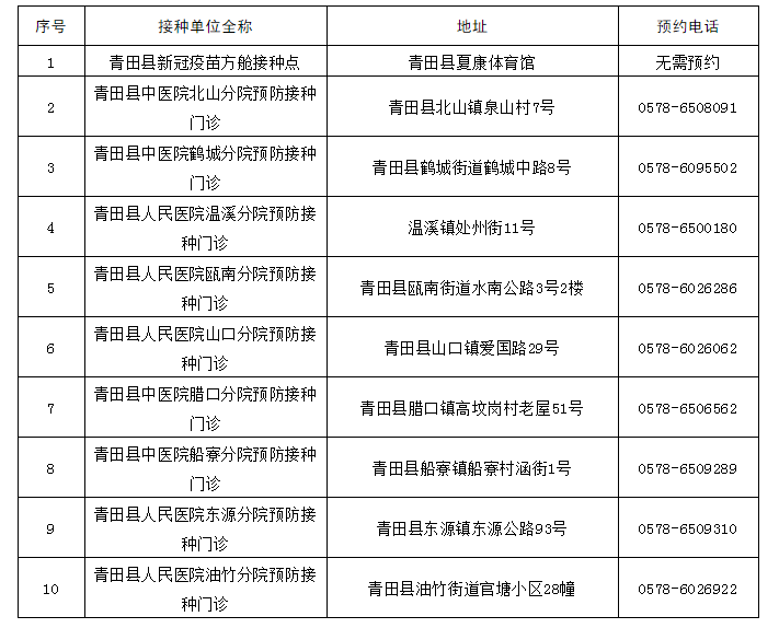 青田縣新冠病毒疫苗接種點(diǎn)及預(yù)約咨詢電話