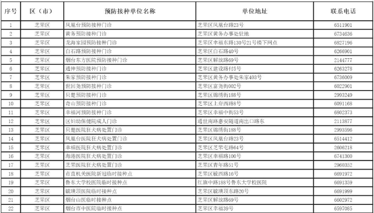 煙臺市芝罘區(qū)新冠病毒疫苗接種點及預約咨詢電話