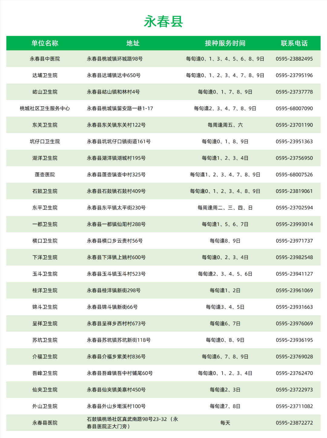 泉州市永春縣新冠病毒疫苗接種點(diǎn)信息