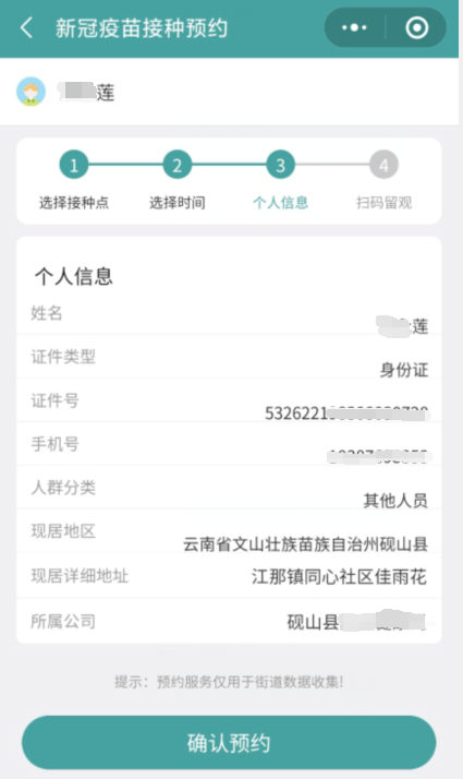 選擇接種點(diǎn)和接種時(shí)間后,確認(rèn)個(gè)人信息,點(diǎn)擊“確認(rèn)預(yù)約”按鈕,完成預(yù)約。