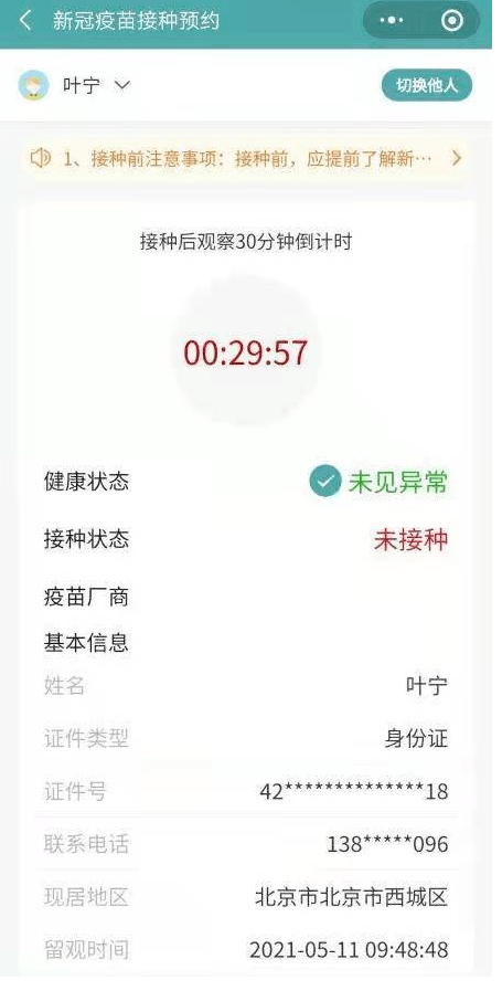完成接種進(jìn)入留觀區(qū),使用微信“掃一掃”掃描接種點(diǎn)的“疫苗接種點(diǎn)留觀簽到二維碼”,進(jìn)入留觀30分鐘倒計(jì)時(shí)。