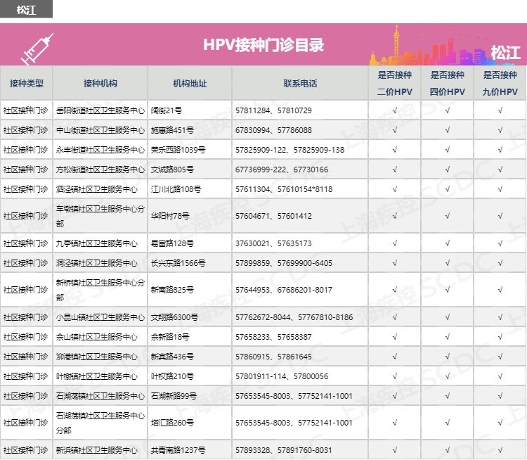 【導(dǎo)讀】:上海市松江區(qū)如何預(yù)約HPV二價(jià)、四價(jià)、九價(jià)宮頸癌疫苗?松江區(qū)宮頸癌疫苗接種點(diǎn)有哪些?有哪些醫(yī)院門診可以接種HPV疫苗?松江區(qū)宮頸癌疫苗預(yù)約電話多少?上海疾控中心公布松江區(qū)hpv疫苗預(yù)約接種點(diǎn)地址、電話、服務(wù)時(shí)間、網(wǎng)上預(yù)約流程及注意事項(xiàng)。有需要接種hpv疫苗的市民可咨詢了解: |