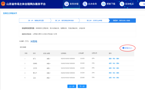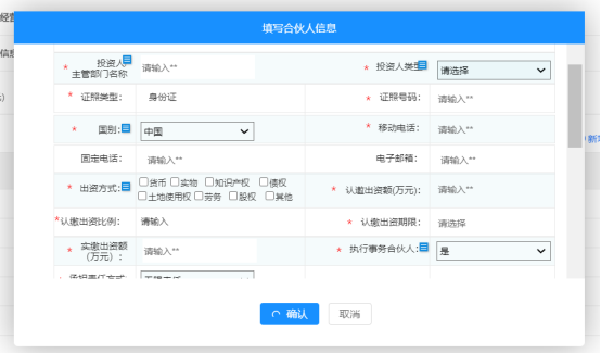 合伙人:合伙人是指共同出資、共同經(jīng)營(yíng)合伙企業(yè)的組織和個(gè)人,根據(jù)承擔(dān)責(zé)任方式對(duì)合伙企業(yè)承擔(dān)責(zé)任,在此環(huán)節(jié),我們要補(bǔ)充合伙人的相關(guān)信息,包括出資比例,認(rèn)繳時(shí)間等,并選擇其中一個(gè)合伙人作為執(zhí)行事務(wù)合伙人。如圖所示。