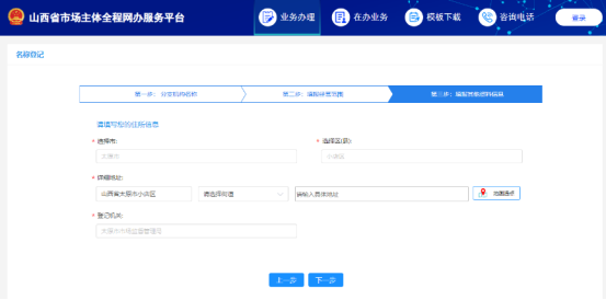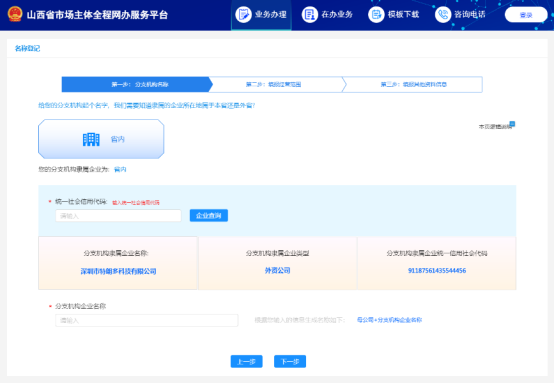 對(duì)于分公司、分支機(jī)構(gòu),名稱自主申報(bào)環(huán)節(jié)共分三步:分公司/分支機(jī)構(gòu)名稱—填報(bào)經(jīng)營(yíng)范圍—填報(bào)其他資料信息。