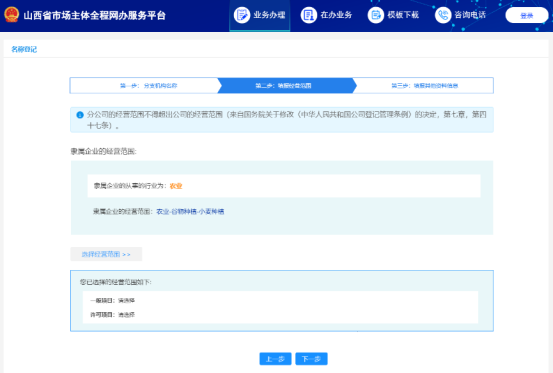 之后,我們要繼續(xù)選擇分公司/分支機(jī)構(gòu)的經(jīng)營(yíng)范圍,根據(jù)國(guó)家相關(guān)規(guī)定要求,分公司的經(jīng)營(yíng)范圍不得超出隸屬企業(yè)的經(jīng)營(yíng)范圍。