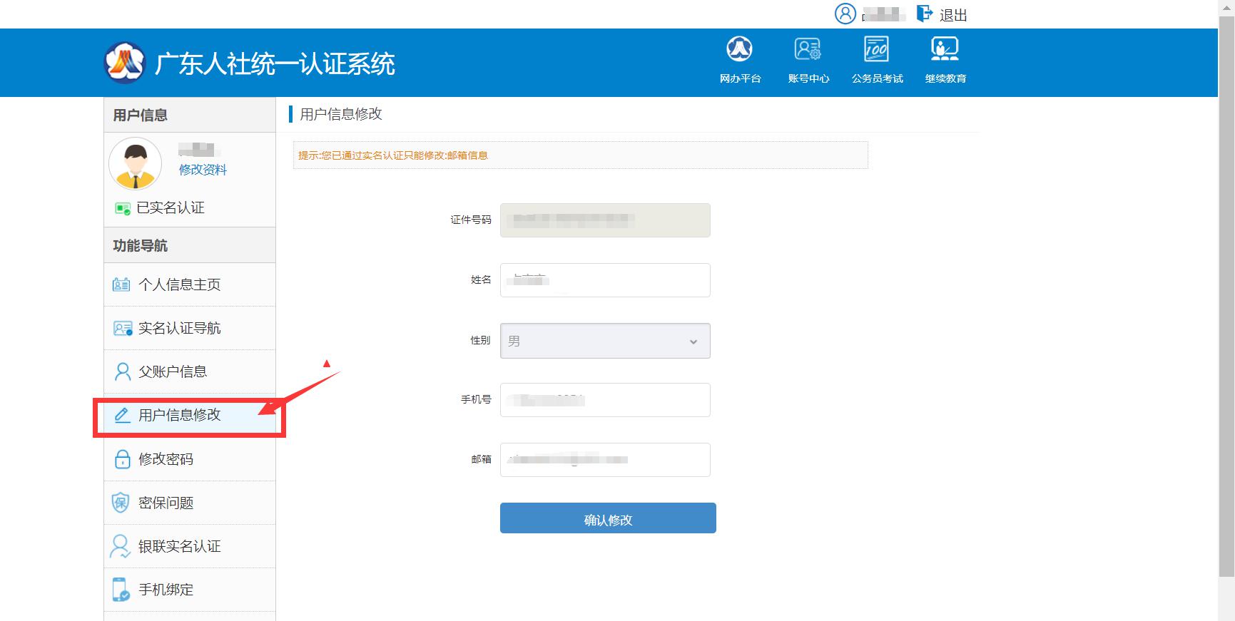 點擊“用戶信息修改”,在右側即可修改個人信息:
