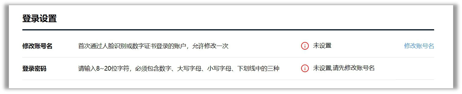 2. 默認(rèn)幫用戶創(chuàng)建的賬戶,每個用戶都有一次修改賬戶名稱的機(jī)會,CA認(rèn)證登錄政務(wù)服務(wù)網(wǎng),選擇“賬戶管理”,進(jìn)入“修改賬戶信息”-“修改資料”頁面,選擇“修改登錄名”,就可以修改默認(rèn)創(chuàng)建的登錄名和設(shè)置登錄密碼,下次登錄也可以使用此賬戶密碼進(jìn)行登錄。