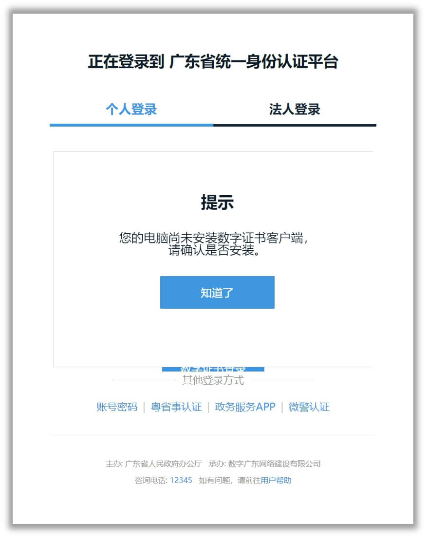 根據(jù)引導(dǎo)頁提示,點擊鏈接下載CA助手;若未安裝數(shù)字證書客戶端(即CA助手),會彈窗提示安裝,點擊“知道了”即可。