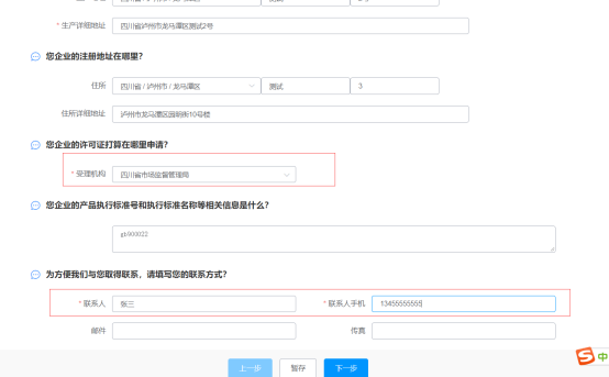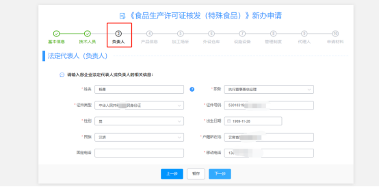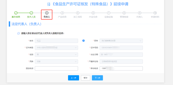 4)“負(fù)責(zé)人”信息標(biāo)簽頁,此標(biāo)簽頁信息一般隨登錄用戶同步過來(可補(bǔ)全或修改負(fù)責(zé)人信息),點(diǎn)擊下一步;