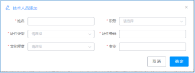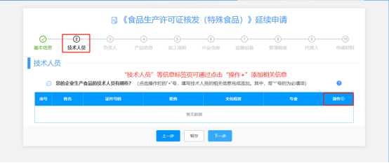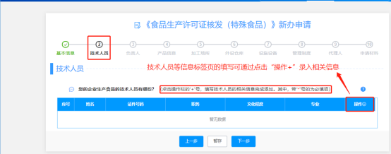 3)“技術(shù)人員”信息標(biāo)簽頁,可通過點(diǎn)擊“操作+”添加技術(shù)人員信息,并對技術(shù)人員信息進(jìn)行填寫,帶*”號為必填項(xiàng)(其他須通過點(diǎn)擊“操作+”添加相關(guān)信息的標(biāo)簽頁都同“技術(shù)人員”的信息錄入一樣)。