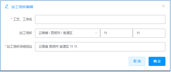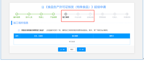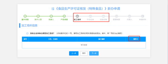 6)“加工場所、外設(shè)倉庫、設(shè)施設(shè)備”這三個(gè)信息標(biāo)簽頁的填寫同“技術(shù)人員”信息標(biāo)簽頁填寫一樣,都可通過點(diǎn)擊“操作+”跳出編輯小窗口,然后對相關(guān)信息進(jìn)行填寫,填寫完后點(diǎn)擊下一步;