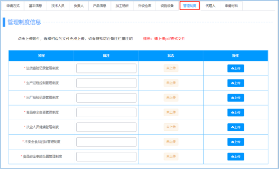 4)“管理制度”信息標(biāo)簽頁為上傳申請需要的管理制度附件(上傳格式為PDF