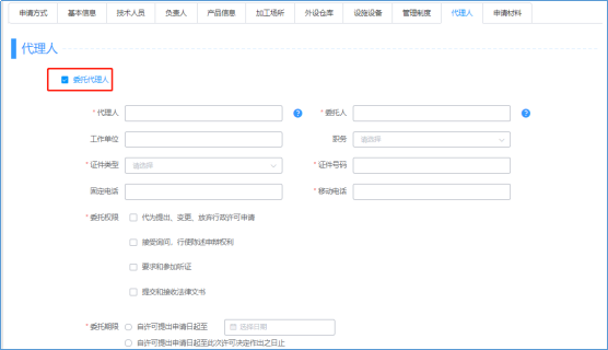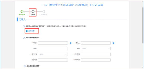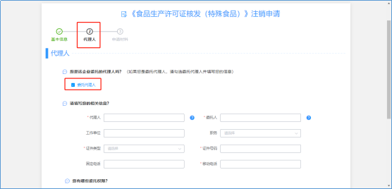 8) “代理人”信息標(biāo)簽頁(根據(jù)需要選擇是否填寫),如需填寫勾選“委托代理人”,并填寫相應(yīng)信息;如不需填寫可直接點(diǎn)擊下一步;