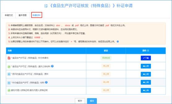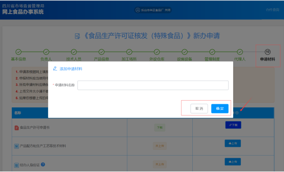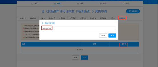 9) “申請材料”信息標(biāo)簽頁為上傳申請?jiān)S可證需要的申請材料附件(同管理制度一樣,上傳附件格式為PDF),已經(jīng)列出的材料名稱可進(jìn)行上傳,如果沒有列出的材料需要上傳的,需要點(diǎn)擊+進(jìn)行添加,上傳完成之后點(diǎn)擊提交并確認(rèn)提交;