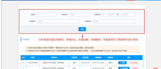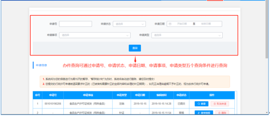 1)提交預(yù)審后,等待審核人員預(yù)審?fù)ㄟ^(一般為五個(gè)工作日內(nèi)),再在“辦件查詢”里面查詢相關(guān)的申請記錄(可通過申請?zhí)枴⑸暾垹顟B(tài)、申請日期、申請事項(xiàng)、申請類型五個(gè)查詢條件進(jìn)行查詢申請記錄)。