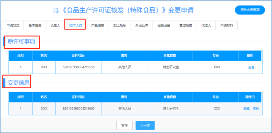 3)對不需變更信息(不需變更信息只可查看,不能編輯),點(diǎn)擊下一步。填寫需要變更信息標(biāo)簽頁,如:“技術(shù)人員”信息標(biāo)簽頁,點(diǎn)擊“操作”添加技術(shù)人員信息,并可對信息進(jìn)行“編輯”、“移除”操作,編輯完后點(diǎn)擊下一步。