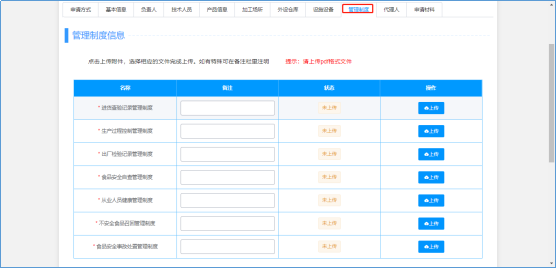7) “管理制度”信息標(biāo)簽頁為上傳申請需要的管理制度附件材料(上傳格式為PDF);