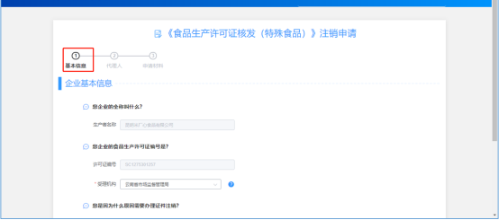 2)申請注銷頁面如下,補(bǔ)全基本信息標(biāo)簽頁(注意:進(jìn)行注銷申請的主體須完成新辦申請過,否則不能進(jìn)行注銷申請),點(diǎn)擊下一步;