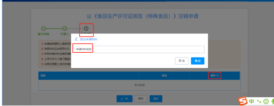 4)“申請材料”信息標(biāo)簽頁為上傳注銷申請需要的申請材料附件(上傳附件格式為doc,docx,pdf),上傳完成之后點(diǎn)擊提交;