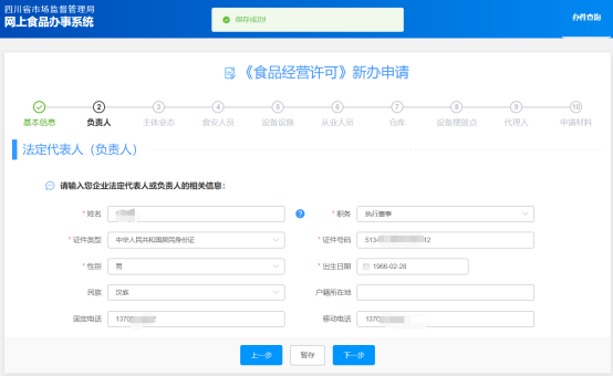 (2)“負(fù)責(zé)人”信息標(biāo)簽頁(yè),此標(biāo)簽頁(yè)信息一般隨登錄用戶同步過來(可補(bǔ)全或修改負(fù)責(zé)人信息),點(diǎn)擊下一步;