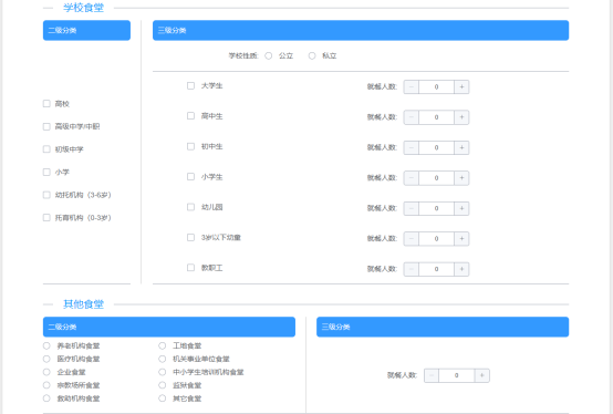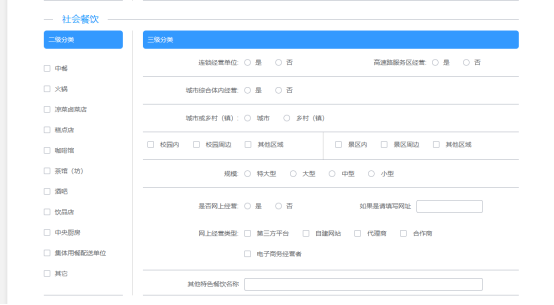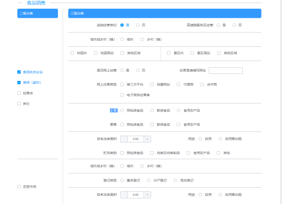 (3)“主體業(yè)態(tài)”標(biāo)簽頁(yè),選擇相應(yīng)的“主體業(yè)態(tài)”(食品銷售經(jīng)營(yíng)者、餐飲服務(wù)經(jīng)營(yíng)者、單位食堂),選擇主體業(yè)態(tài)后需要進(jìn)行二級(jí)和三級(jí)分類進(jìn)行勾選,勾選完成后在下方中的是否有實(shí)體門店和經(jīng)營(yíng)項(xiàng)目進(jìn)行勾選 ;