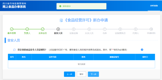 (4)“食安人員”此頁(yè)簽填寫時(shí),可通過點(diǎn)擊“操作+”跳出編輯小窗口,然后對(duì)相關(guān)信息進(jìn)行填寫,填寫完后點(diǎn)擊下一步;