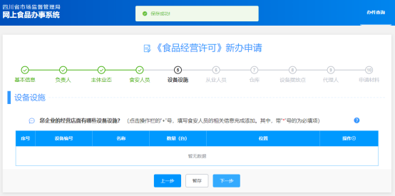 (5)“設(shè)備設(shè)施”此頁(yè)簽填寫時(shí),可通過點(diǎn)擊“操作+”跳出編輯小窗口,然后對(duì)相關(guān)信息進(jìn)行填寫,填寫完后點(diǎn)擊下一步;