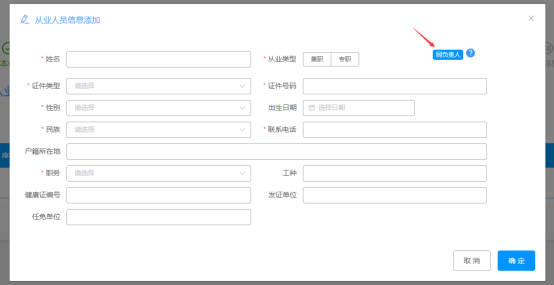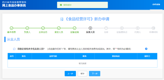 (6)“從業(yè)人員”此頁(yè)簽填寫時(shí),可通過點(diǎn)擊“操作+”跳出編輯小窗口,然后對(duì)相關(guān)信息進(jìn)行填寫,填寫完后點(diǎn)擊下一步;