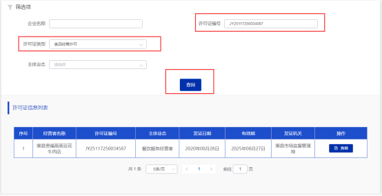 通過輸入許可證編號(hào)和許可證類型,然后點(diǎn)擊查詢: