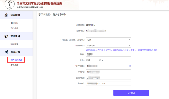 2)如果您已經(jīng)提交項目,則“所在省”、“所屬的單位”、“姓名”、“性別”、“出生日期”這5項信息,將不允許在修改。