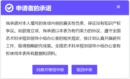 - 在進(jìn)入項目申報頁面前,系統(tǒng)將會顯示“申請者的承諾”對話框,如下圖所示,單擊<同意并繼續(xù)申報>系統(tǒng)將跳轉(zhuǎn)到填寫申報項目資料界面;單擊<取消申報>系統(tǒng)將返回到我的申報界面;