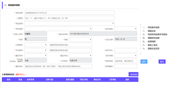 - 在填寫申報項目資料界面,點擊右側(cè)內(nèi)容導(dǎo)航,可以快速跳轉(zhuǎn)到對應(yīng)內(nèi)容區(qū)域。按照界面提示,填寫項目名稱、主題詞等申報資料,單擊<保存>按鈕,系統(tǒng)將保存當(dāng)前填寫的所有數(shù)據(jù)(注:保存操作,系統(tǒng)不進(jìn)行內(nèi)容驗證。);單擊<提交>,系統(tǒng)將自動檢查填寫的規(guī)范和必填字段是否全部填寫,如果全部正確,系統(tǒng)將再次提示“申請者的承諾”,點擊“確認(rèn)并提交”按鈕,系統(tǒng)將填寫的申報項目提交給科研單位審核,點擊“取消”將返回填報界面。