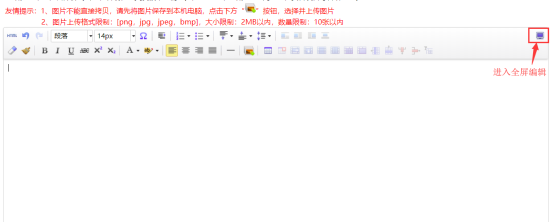 為了更好的編輯文本內(nèi)容,您可以使用富文本編輯器的全屏編輯功能,進(jìn)入全屏編輯模式,功能按鈕如下圖所示,在工具欄的右上角的“