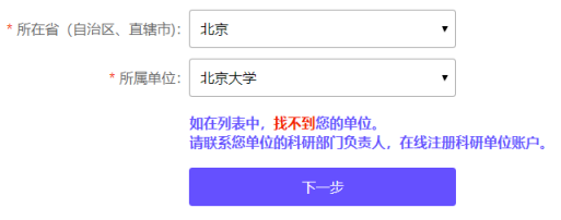 - 在用戶類型選擇界面,首先選擇您單位“所在?。ㄗ灾螀^(qū)、直轄市)”,然后在“所屬單位”中選擇您所在的單位(如找不到您的單位,請聯(lián)系您所在單位的科研部門負(fù)責(zé)人,在線注冊科研單位賬戶),點擊一步,進(jìn)入賬戶信息注冊界面。