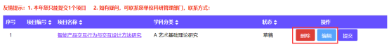 - 當(dāng)您已保存了一個申報項目,則此項目在提交前為“草稿”狀態(tài),那么在該項目的操作列中將會顯示出<編輯>和<刪除>按鈕;