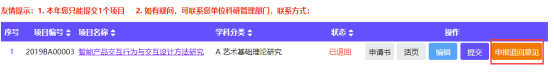 - 如果您只需要修改內(nèi)容,您可以單擊<編輯>按鈕,將需要修改的字段修改過來再重新單擊<提交>;如果您需要查看科研單位退回修改意見,您可以單擊<申報退回意見>。