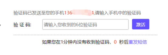 - 完成注冊后,系統(tǒng)將自動給您注冊時所填寫的手機號,發(fā)送短信驗證碼,并跳轉(zhuǎn)到激活賬號頁面,如下圖所示: