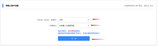 4)首先在“所在?。ㄗ灾螀^(qū)、直轄市)”選擇框中,選擇您單位所在的省,然后在“所屬單位”選擇框中,選擇您的所屬單位,點擊“下一步”按鈕,進(jìn)入個人信息注冊界面(如圖2.3-4所示)。