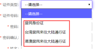 (1) 證件類型:支持居民身份證、臺灣居民來往大陸通行證、港澳居民來往大陸通行證三種證件,如下圖所示:
