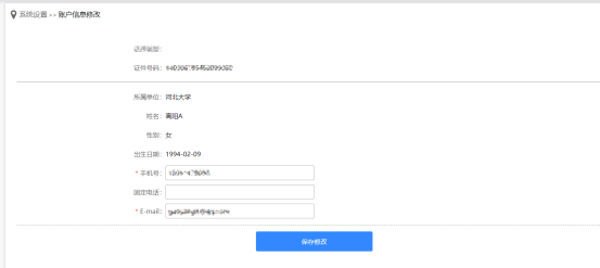 3) 修改需要變更的個人信息,點擊“保存修改”按鈕,系統(tǒng)會將您所修改個人資料信息保存到系統(tǒng)。